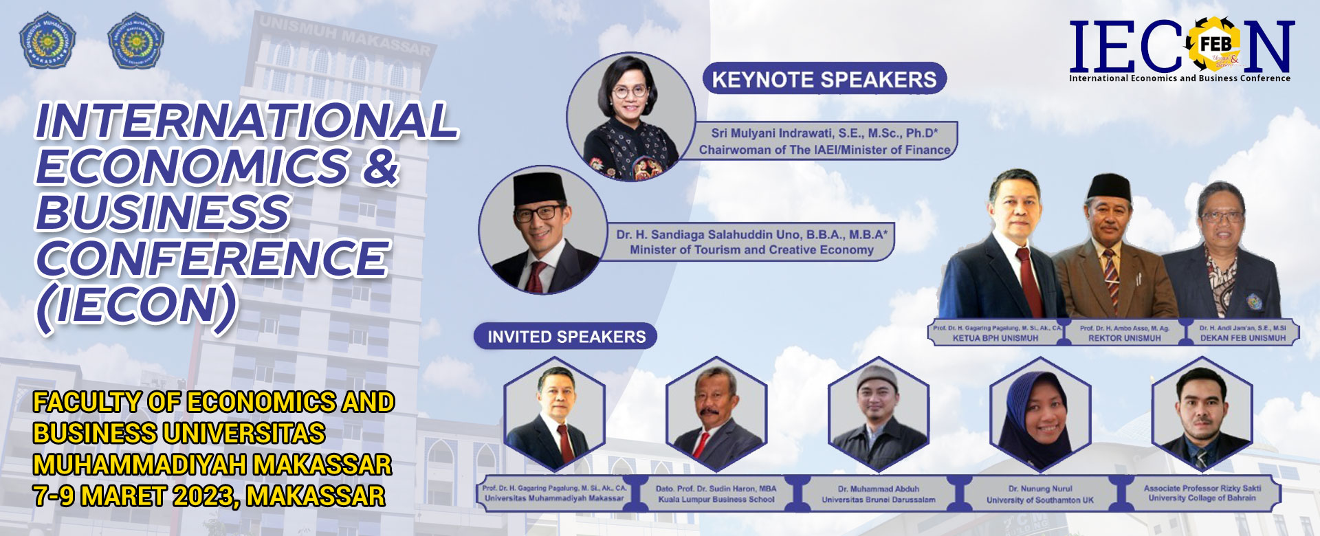 The 1st INTERNATIONAL ECONOMICS AND BUSINESS CONFERENCE (IECON) 2023 is an Annual International Conference organized by Faculty Economics and Business, Universitas Muhammadiyah Makassar.