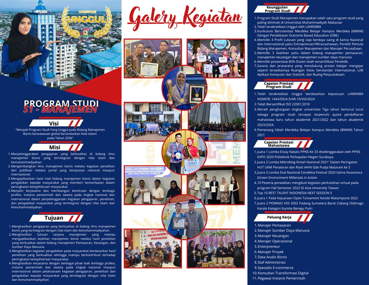 | 3. | Konsultan Manajemen | 1. Memiliki kemampuan kepemimpinan (leadership) yang ditandai dengan sikap bertanggungjawab, mandiri, memotivasi, menginspirasi, dan mampu bekerjasama dengan orang lain. 2. Memiliki kemampuan manajerial yang ditunjukkan dengan sikap dapat dipercaya, dapat berkomunikasi dengan baik, dan mampu mengelola tugas dan tanggungjawab secara kolektif. 3. Memiliki kemampuan mengambil keputusan yang ditunjukkan dengan sikap percaya diri terhadap diri sendiri, serta dapat memengaruhi dan menggerakkan orang lain dalam arti positif. 4. Memiliki visi yang kuat terhadap bidang ilmu manajemen yang ditampilkan melalui kemampuan memberikan masukan-masukan, mengolah dan mengkomunikasikan ide dan gagasan pada orang lain. 5. Memiliki sikap positif sebagai pengambil keputusan yang diwujudkan dalam kemampuan menghasilkan layanan yang dapat dimanfaatkan orang banyak. 6. Menguasai bidang ilmu manajemen pemasaran, manajemen keuangan, manajemen produksi dan operasional serta manajemen sumber daya. 7. Manusia yang didedikasikan untuk mendukung profesi wirausaha yanng dapat memberikan layanan jasa dan atau produk dengan prima. |